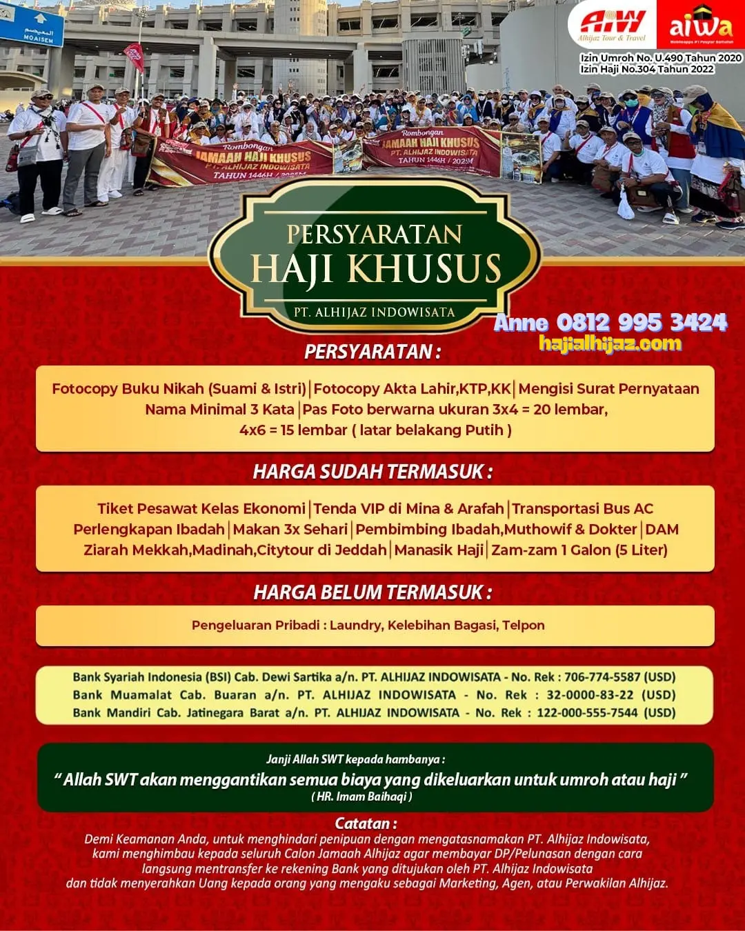 Uang Muka kami setor ke rekening BPKH Kemenag untuk mendapatkan nomor Porsi Haji Khusus maksimal 3x24 jam